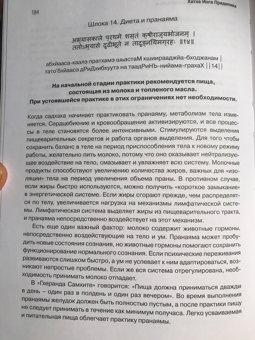 «На начальной стадии практики рекомендуется пища, состоящая из молока и топленого масла. При установившейся практике в этих ограничениях нет необходимости», - пишет Сватмарама в 14 шлоке 2-ой главы. Непастеризованное молоко имеет кислотность близкую к нейтральной, поэтому не оказывает существенного влияния на кислотный состав крови и может свободно употребляться в период освоения практики пранаямы. «Когда происходит адаптация дыхательного центра к задержкам дыхания, он перестает столь чутко реагировать на повышение кислотности, и необходимость в щелочной диете отпадает», - комментирует Артем Фролов.